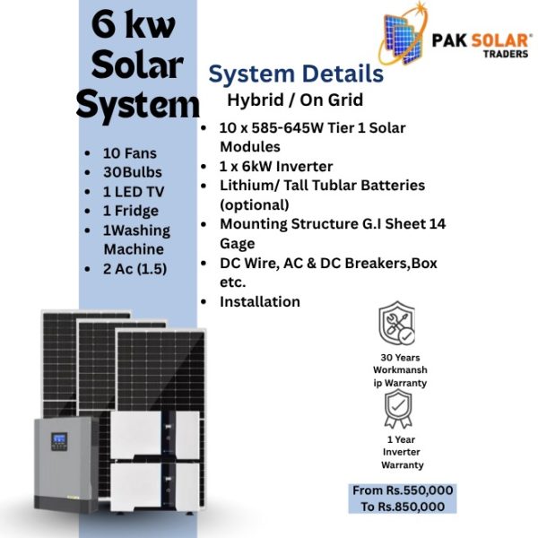 The cost of a 6kW system in Pakistan can vary, but it range generally depend on whether it includes battery storage.